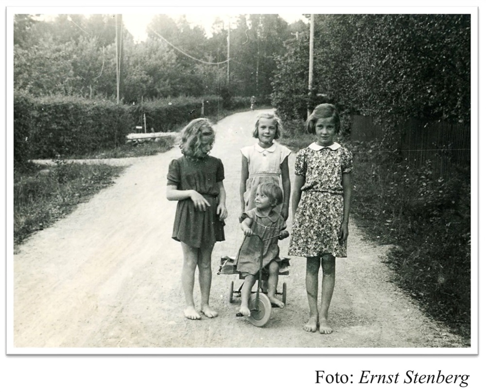 Granitvägen sommaren 1945. Barfota flickor på grusväg i Viggbyholm. På trehjulingen sitter Maj Stenberg, numera Maj Frölid, som också har skänkt bilden till vårt bildarkiv. Kanske någon kan veta vilka de andra flickorna är? Hör i så fall av er till THF Bildarkiv.
